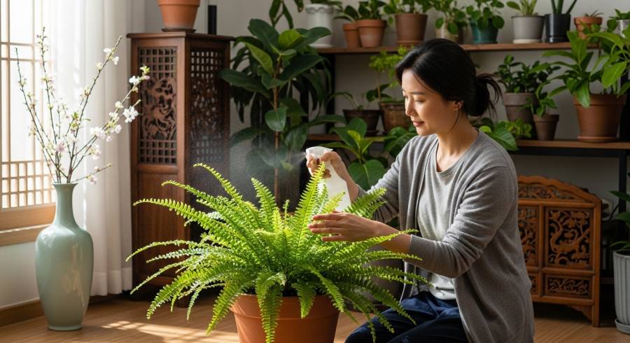 무늬보스턴고사리 잎 끝 갈변 대처법 중 습도 관리는 특히 겨울/여름철 필수입니다.